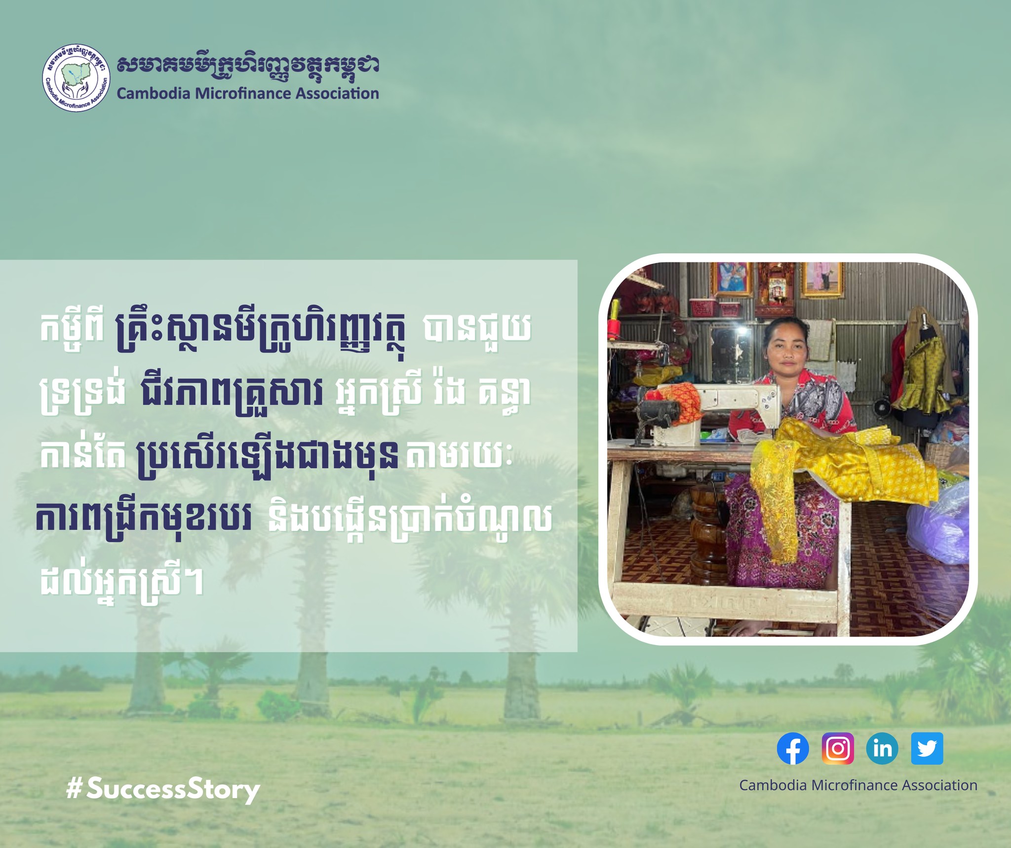 អ្នកស្រី រ៉ង គន្ធា អាយុ ៣៤ឆ្នាំ ប្រកបរបរជាជាងកាត់ដេរ និងស្វាមីមានមុខរបរជាជាងម៉ូតូ មានសមាជិកគ្រួសារចំនួន ៤នាក់ បានឱ្យដឹងថា អ្នកស្រីប្រកបរបរនេះតាំងពីឆ្នាំ២០១៦ មកម្ល៉េះ ហើយមកដល់ឆ្នាំ២០១៩ អាជីវកម្មរបស់អ្នកស្រីត្រូវការដើមទុនបន្ថែម។ គ្រានោះអ្នកស្រីមិនដឹងថា គួរតែស្នើកម្ចីពីស្ថាប័នណាដែលមិនតម្រូវឱ្យមានទ្រព្យដាក់ធានានោះទេ ម៉្យាងវិញទៀតអ្នកស្រីក៏មិនចង់ខ្ចីប្រាក់ពីអ្នកចងការក្នុងភូមិ ព្រោះថាអត្រាការប្រាក់ខ្ពស់ តែជាសំណាងល្អ អ្នកស្រីបានស្គាល់គ្រឹះស្ថានមីក្រូហិរញ្ញវត្ថុមួយតាមរយៈម្តាយរបស់អ្នកស្រី ហើយក៏បានសម្រេចចិត្តប្រើប្រាស់កម្ចីជាលើកដំបូងចំនួន ២លានរៀល ដើម្បីទៅទិញសាច់ក្រណាត់បន្ថែម។