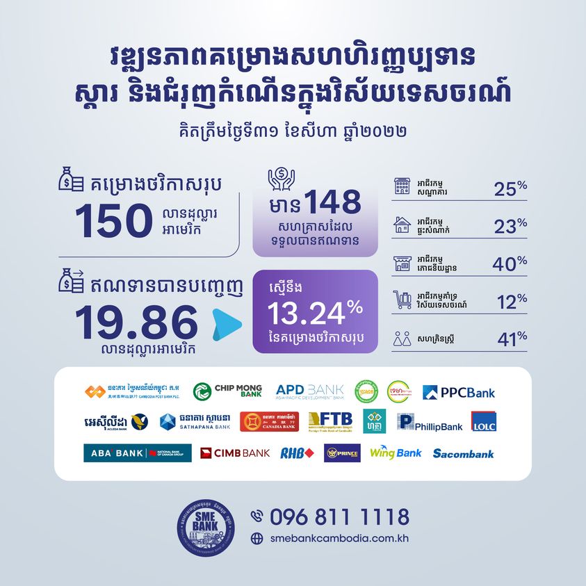 ភ្នំពេញ ៖ ធនាគារសហគ្រាសធុនតូច និងមធ្យម កម្ពុជា (SME Bank of Cambodia) បានបញ្ចេញកម្ចីឥណទានជិត ២០ លានដុល្លារ ជូយដល់សហគ្រាសធុនតូច និងមធ្យមស្ថិតក្នុងវិស័យទេសចរណ៍ចំនួន ១៤៨ ដើម្បីចូលរួមស្តារ និងជំរុញកំណើនក្នុងវិស័យទេសចរណ៍ឡើងវិញពីវិបត្តិជំងឺកូវីដ១៩។