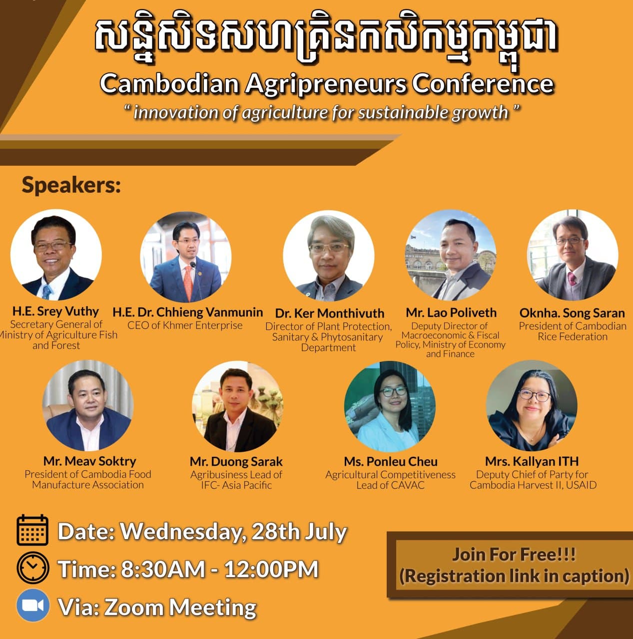 សន្និសីទសហគ្រិនកសិកម្មកម្ពុជានេះ មានការចូលរួមក្រោមអធិបតីដ៏ខ្ពង់ខ្ពស់នៃវាគ្មិនកិត្តិយសជាច្រើនរូប ដែលនឹងឡើងបកស្រាយប្រធានបទទាំង៤នោះមានដូចជា៖