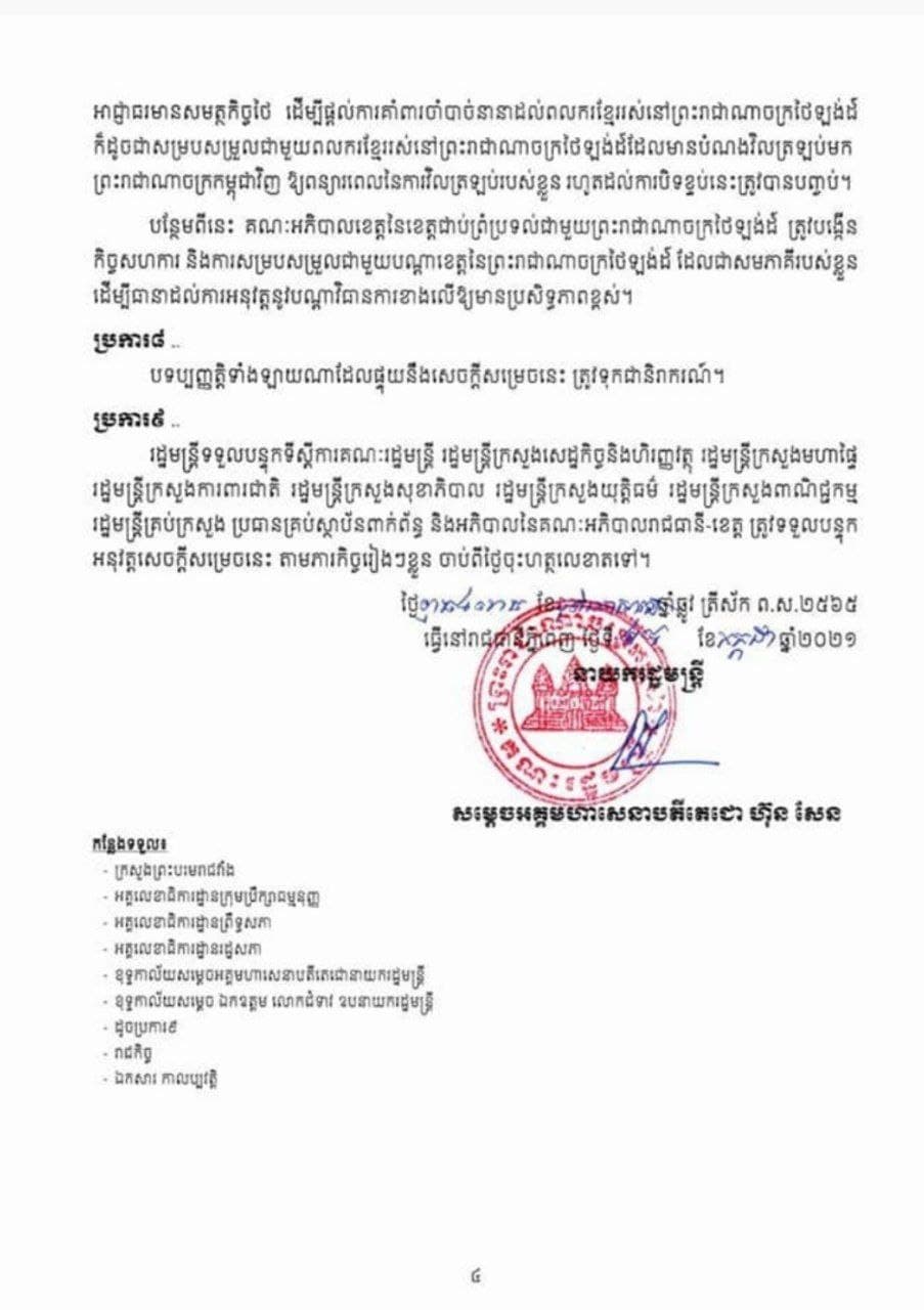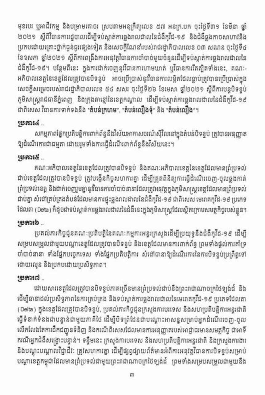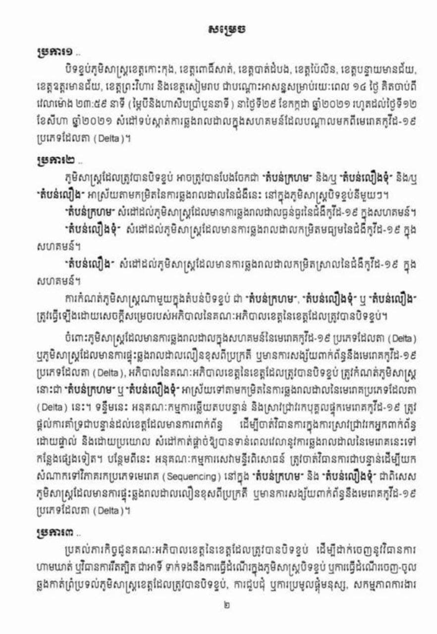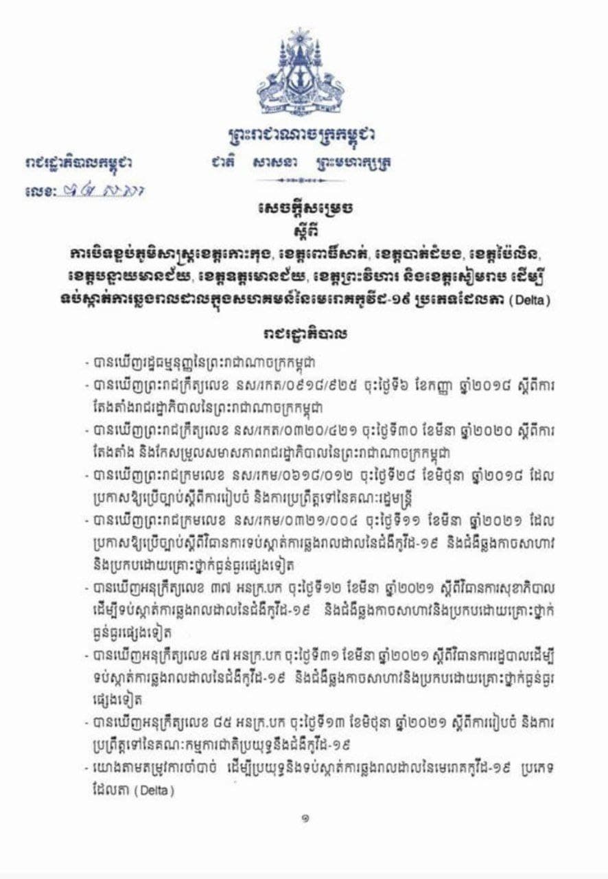 រាជរដ្ឋាភិបាលបានសម្រេចបិទខ្ទប់ភូមិសាស្ត្រខេត្តចំនួន៨ រួមមានខេត្តកោះកុង, ខេត្តពោធិ៍សាត់, ខេត្តបាត់ដំបង, ខេត្តប៉ៃលិន, ខេត្តបន្ទាយមានជ័យ, ខេត្តឧត្តរមានជ័យ, ខេត្តព្រះវិហារ និងខេត្តសៀមរាប ជាបណ្តោះអាសន្នរយៈពេល ១៤ ថ្ងៃ គិតចាប់ពីវេលាម៉ោង ២៣:៥៩ នាទី នាថ្ងៃទី ២៩ ខែកក្កដា ឆ្នាំ២០២១ រហូតដល់ថ្ងៃទី១២ ខែសីហា ឆ្នាំ២០២១ ។