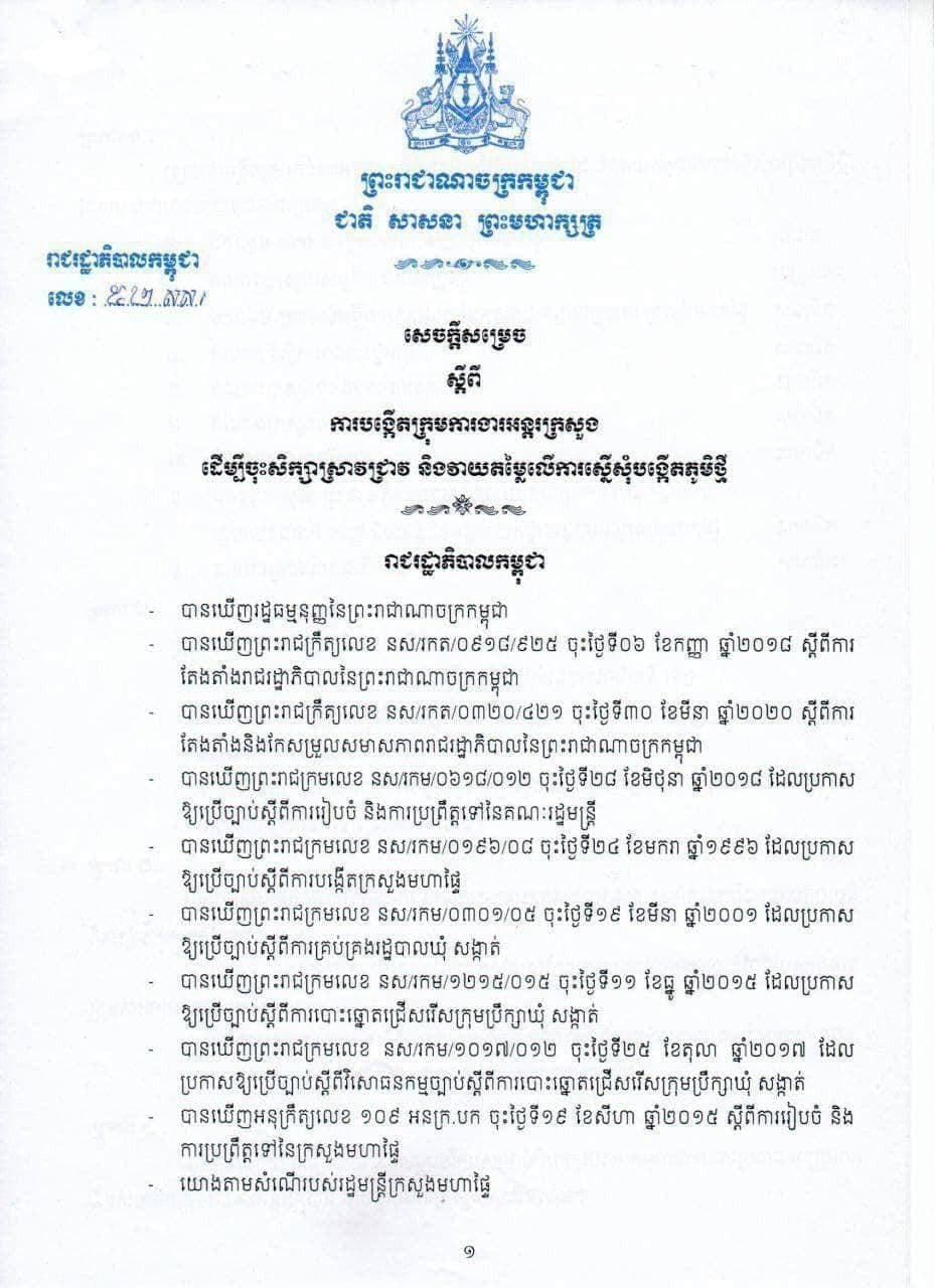 សម្ដេចតេជោ ហ៊ុន សែន នាយករដ្ឋមន្ត្រីនៃព្រះរាជាណាចក្រកម្ពុជាបានចេញសេចក្ដីសម្រេចបង្កើតក្រុមការងារអន្តរក្រសួង ដើម្បីចុះស្រាវជ្រាវ និងវាយតម្លៃលើការស្នើសុំបង្កើតភូមិថ្មីរបស់រដ្ឋបាលរាជធានី/ខេត្ត ដោយមានឯកឧត្តម លេង វី រដ្ឋលេខាធិកាក្រសួងមហាផ្ទៃជាប្រធាន និងសមាសភាពមន្ត្រីថ្នាក់ដឹកនាំជាន់ខ្ពស់តំណាងក្រសួងពាកព័ន្ធចំនួន៦ និងមន្ត្រីថ្នាក់រាជធានី/ខេត្ត មួយចំនួនទៀតជាសមាជិក។