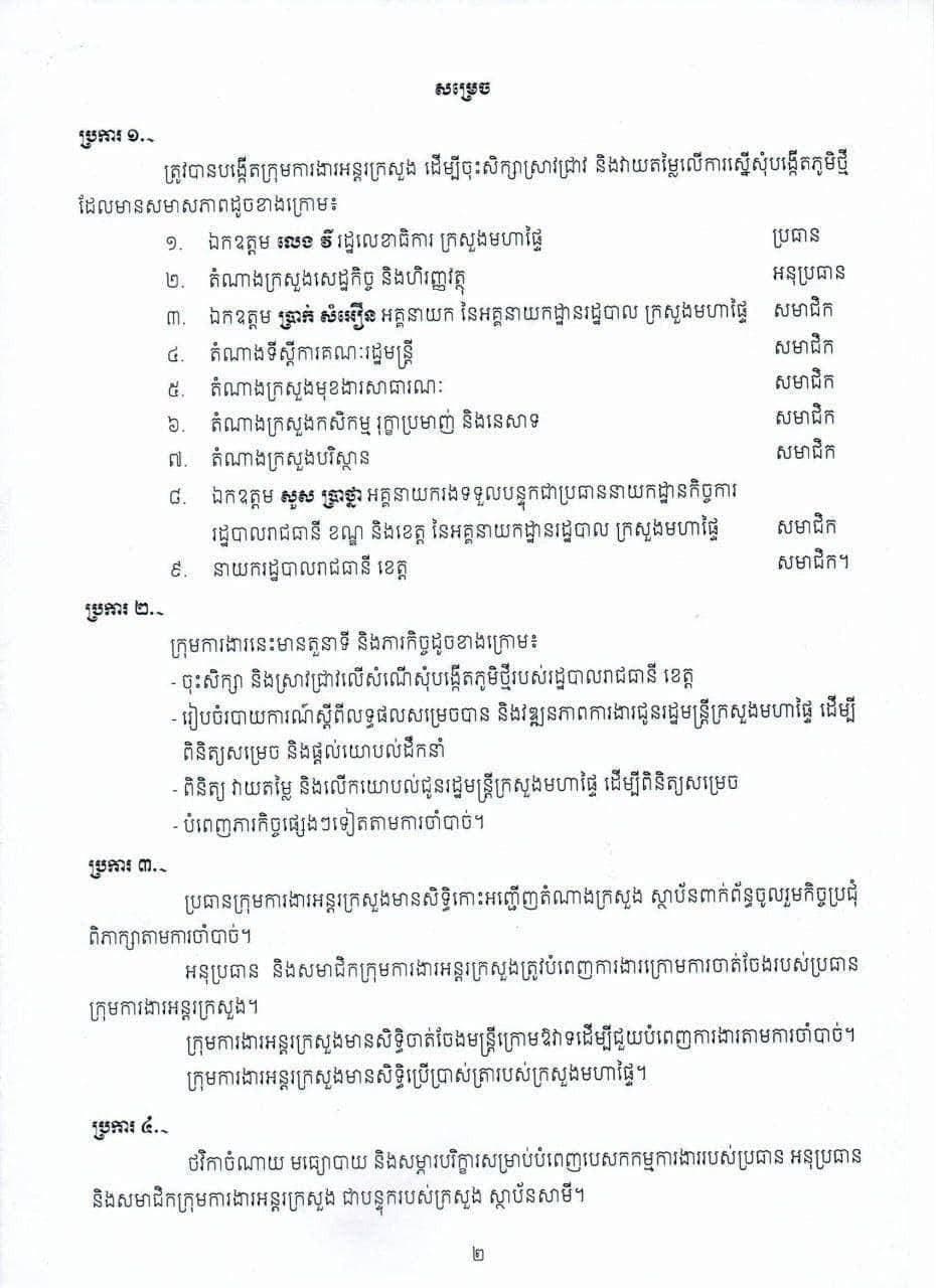 តាមរយៈសេចក្ដីសម្រេចលេខ 52 សសរ ចុះថ្ងៃទី22 ខែមេសា ឆ្នាំ2021 ក្រោមចំណាររបស់សម្ដេចតេជោ ហ៊ុន សែន នាយករដ្ឋមន្ត្រីនៃព្រះរាជាណាចក្រកម្ពុជាបានបញ្ជាក់ថា ក្រុមការងារដែលបានតែងតាំងទាំងអស់មានតួនាទីចុះសិក្សា និងស្រាវជ្រាវលើសំណើសុំបង្កើតភូមិថ្មីរបស់រដ្ឋបាលរាជធានី/ខេត្ត រៀបចំរបាយការណ៍ស្ដីពីលទ្ធផលសម្រេចបាន និងវឌ្ឍនភាពការងារជូនរដ្ឋមន្ត្រីក្រសួងមហាផ្ទៃ ពិនិត្យសម្រេច និងផ្តល់យោបល់ដឹកនាំ ពិនិត្យ និងវាយតម្លៃ និងលើកយោបល់ជូនរដ្ឋមន្ត្រីក្រសួងមហាផ្ទៃ ដើម្បីពិនិត្យសម្រេច រួមជាមួយនឹងការបំពេញភារកិច្ចផ្សេងៗទៀតតាមការចាំបាច់។