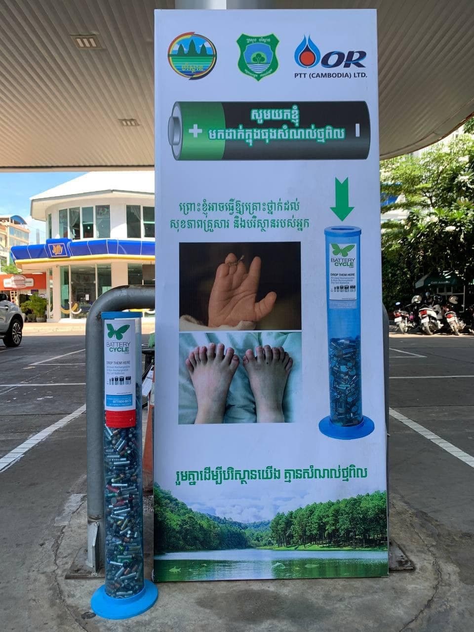 ក្នុងគោលបំណងទប់ស្កាត់ការសាយភាយសារធាតុគ្រោះថ្នាក់ចូលទៅក្នុងបរិស្ថាន និងការពារសុខភាពមនុស្សពីផលប៉ះពាល់ ក្រសួងបរិស្ថានបាន និងកំពុងអនុវត្តគម្រោងប្រមូលសំណល់ថ្មពិល ដោយការដាក់ធុងសំណល់ថ្មពិលនៅតាមទីតាំងបុរី ផ្សារទំនើប ស្ថានីយ៍ប្រេងឥន្ធនៈ រួមមាន ជីប ម៉ុង នរោម៉ល និងមណ្ឌល ជីប ម៉ុង បាក់ទូក បុរី ប៉េង ហួត បឹងស្នោរ និងស្ថានីយប្រេងឥន្ធនៈភីធីធីវត្តនាគវ័ន បូកគោ ផ្សារតូច និងបឹងស្នោរ។