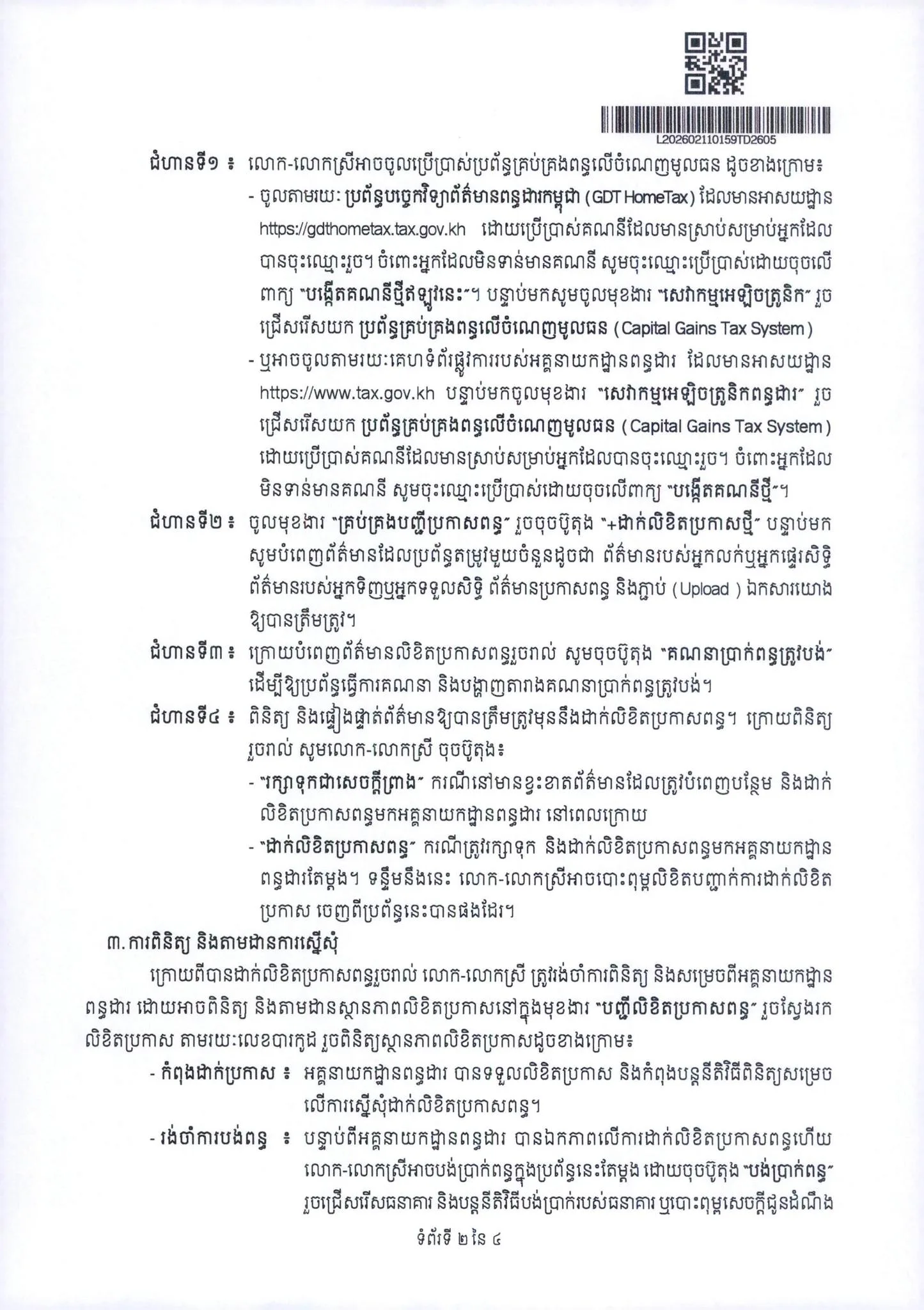 ជំហានទី ២ ត្រូវ​ចូលទៅកាន់មុខ​ងារ គ្រប់គ្រង​បញ្ជី​ប្រកាសពន្ធ រួច​ចុច​លើប៊ូតុង​ ដាក់​លិខិត​ប្រកាស​ថ្មី បន្ទាប់មក បំពេញព័ត៌មានដែល​ប្រព័ន្ធតម្រូវ​មួយចំនួន ដូចជា​ព័ត៌មាន​របស់​អ្នកលក់​ ឬអ្នកផ្ទេរ​សិទ្ធិ ព័ត៌មាន​របស់អ្នកទិញ ឬអ្នកទទួលសិទ្ធិ​ ព័ត៌មាន​ប្រកាស​ពន្ធ និងភ្ជាប់​( Upload ) ឯកសារ​យោង​ឱ្យ​បានត្រឹមត្រូវ។