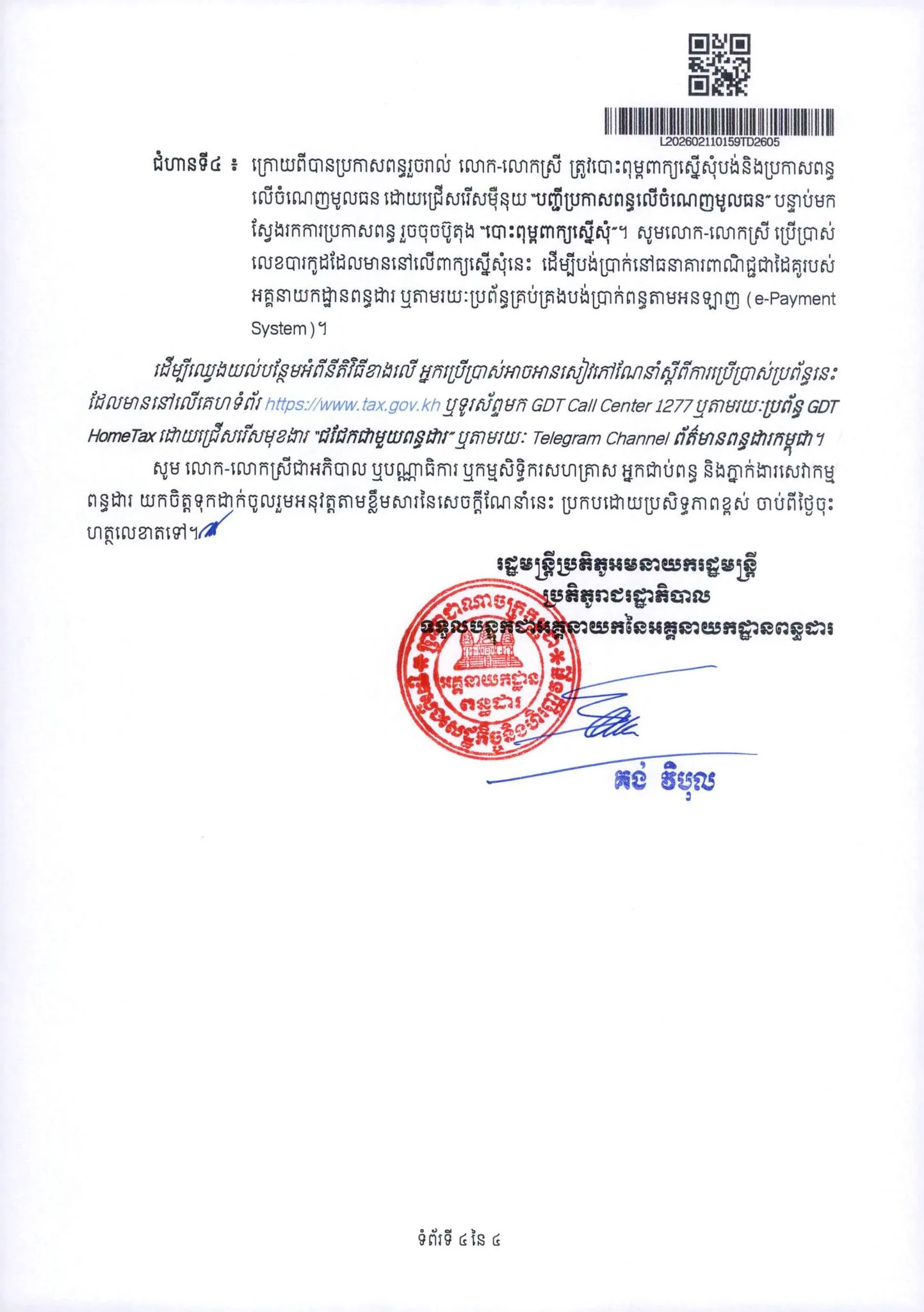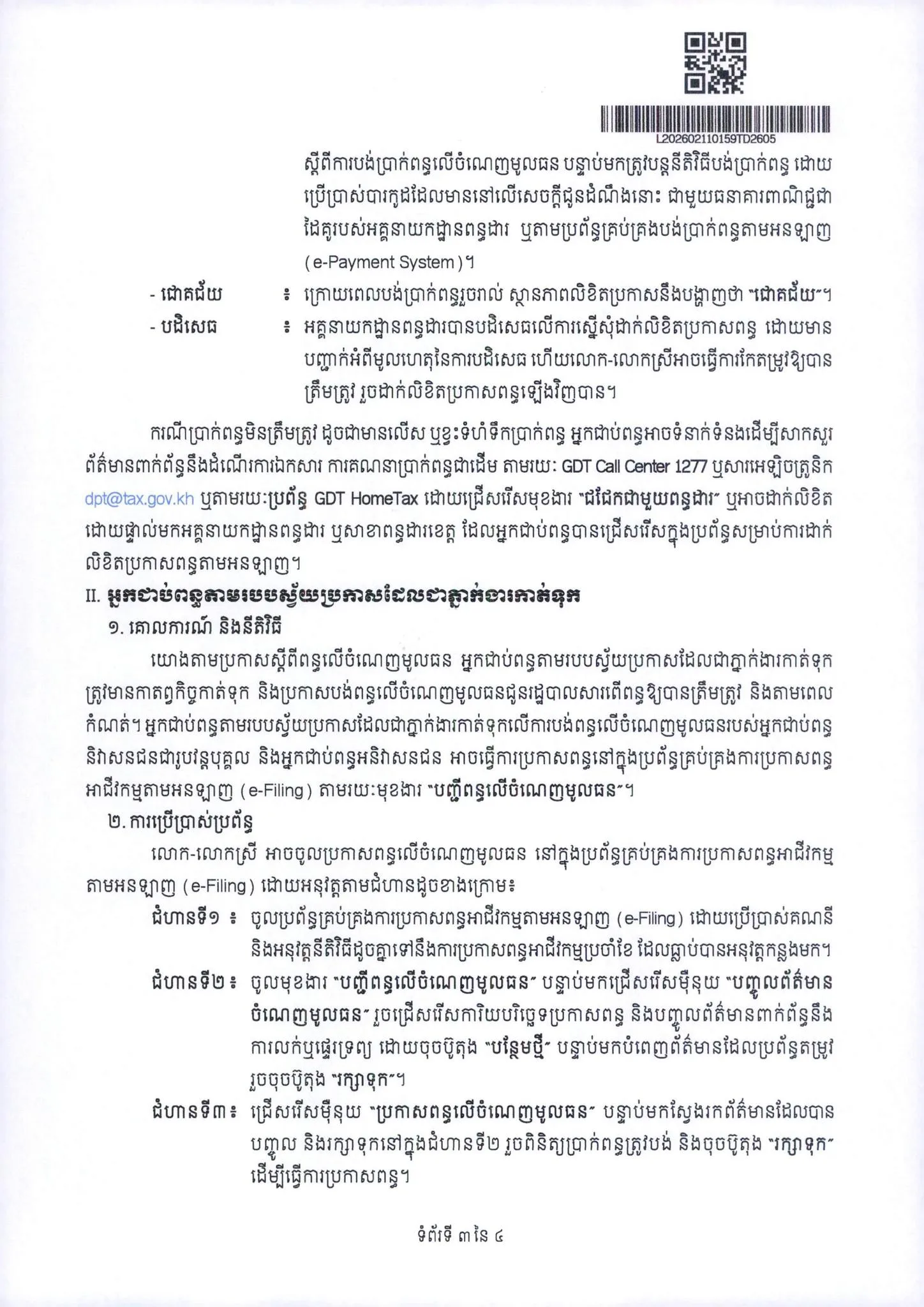 ក្រោយពេល​បង់ប្រាក់​ពន្ធរួចរាល់​ហើយ ស្ថានភាពលិខិត​នឹង​បង្ហាញថា​ជោគជ័យ  ប៉ុន្តែ​បើសិនជា​ប្រព័ន្ធ​បង្ហាញថាពាក្យ​ « បដិសេធ » នោះមានន័យថា ការ​បំពេញ មានភាពចន្លោះប្រហោង ដែលតម្រូវ​ឱ្យ​ពិនិត្យ​និង​បំពេញ​ឱ្យបានត្រឹមត្រូវ​ រួចដាក់លិខិតប្រកាសពន្ធឡើងវិញ​​។