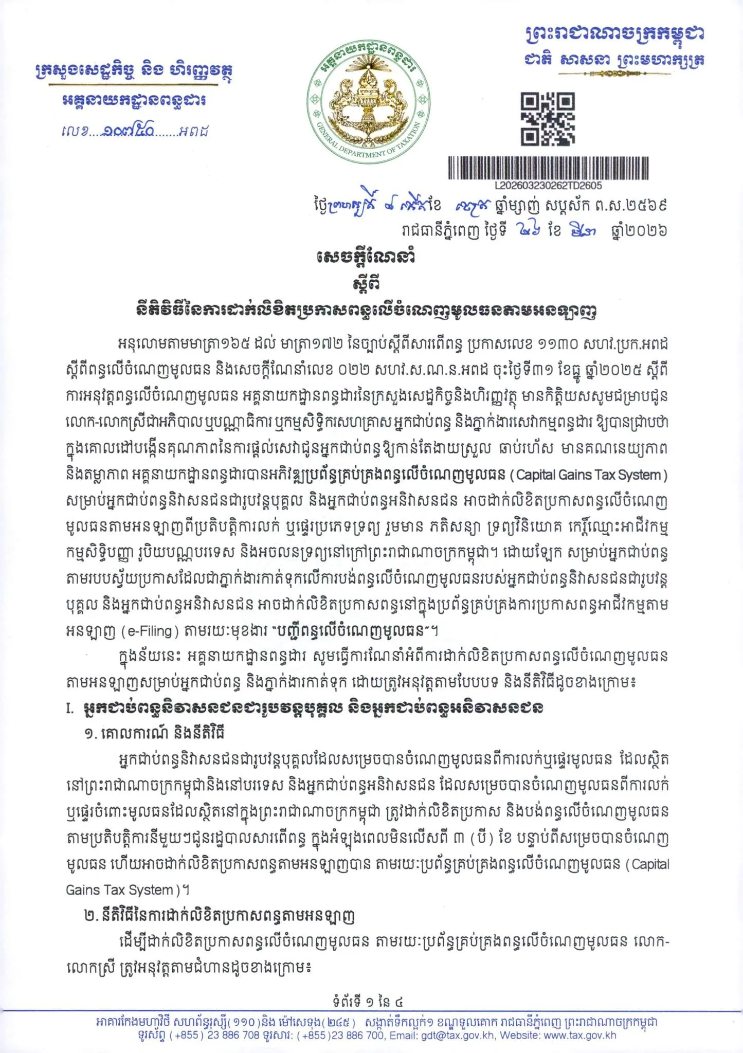 ភ្នំពេញ៖ ក្នុងពេលដែល​ពន្ធលើ​ចំណេញធន នឹង​ត្រូវ​ចាប់ផ្ដើមអនុវត្ត​ក្នុងឆ្នាំ ២០២៦ នេះ អគ្គនាយក​ដ្ឋាន​ពន្ធដារ​ បានបង្ហាញពី​នីតិវិធី​នៃការដាក់​លិខិត​ប្រកាសពន្ធតាមអនឡាញ សម្រាប់អ្នកជាប់ពន្ធ​ ដើម្បីសម្រួលដល់ការ​ងារប្រកាសពន្ធ ឱ្យ​កាន់តែលឿនរហ័ស ក៏ដូចជាបង្ហាញពី​គណនេយ្យភាព​ និង​តម្លាភាព។