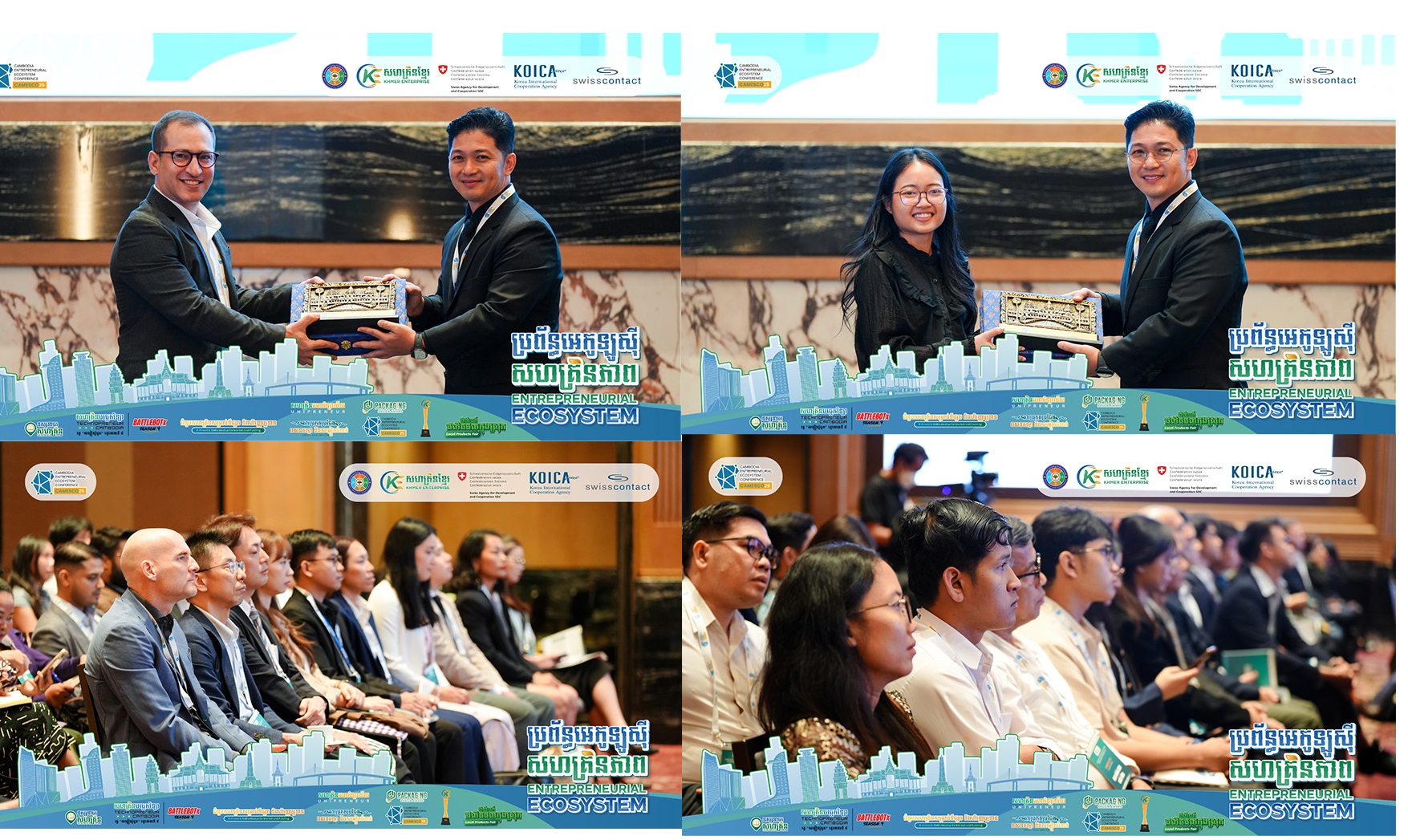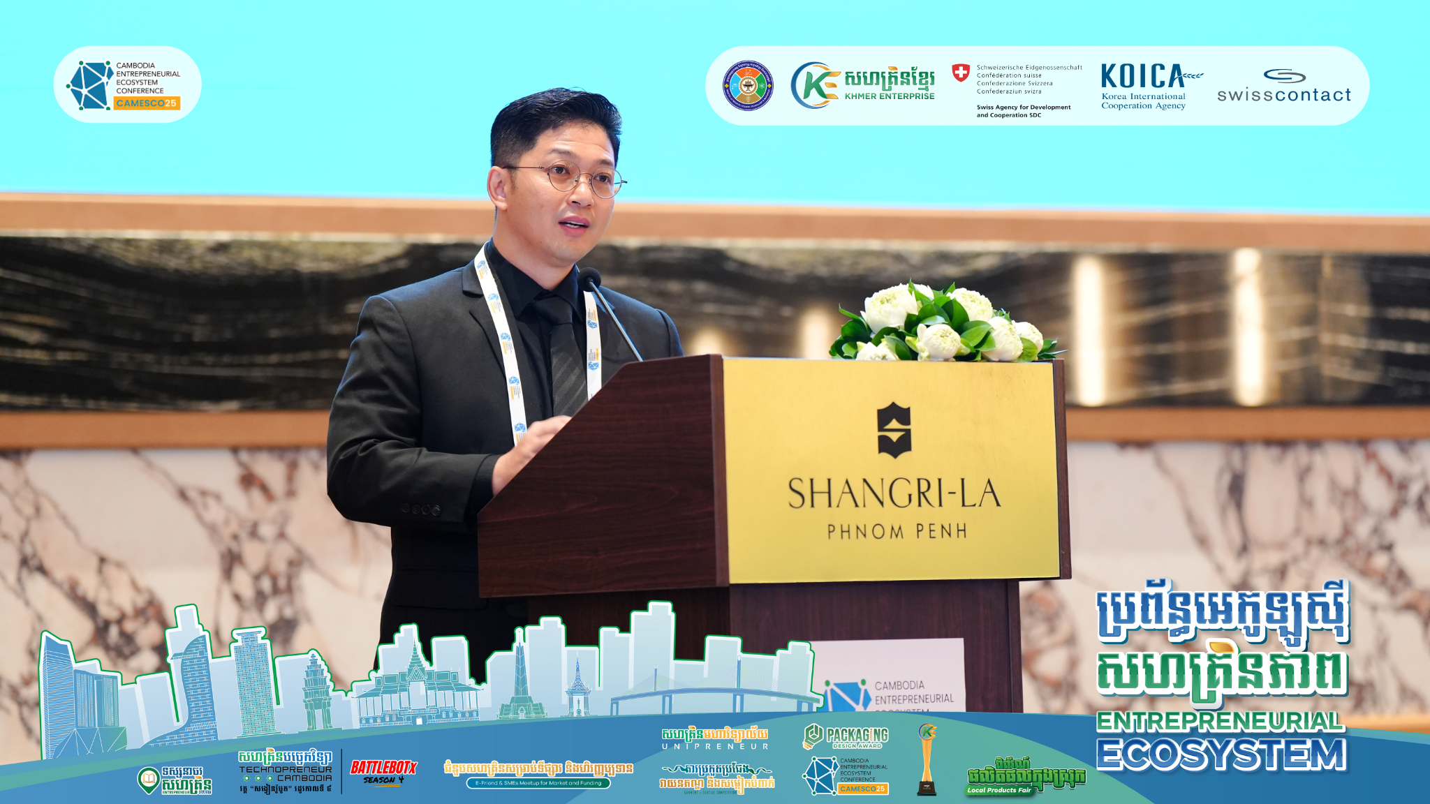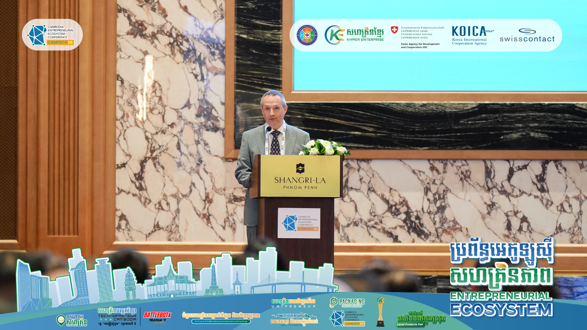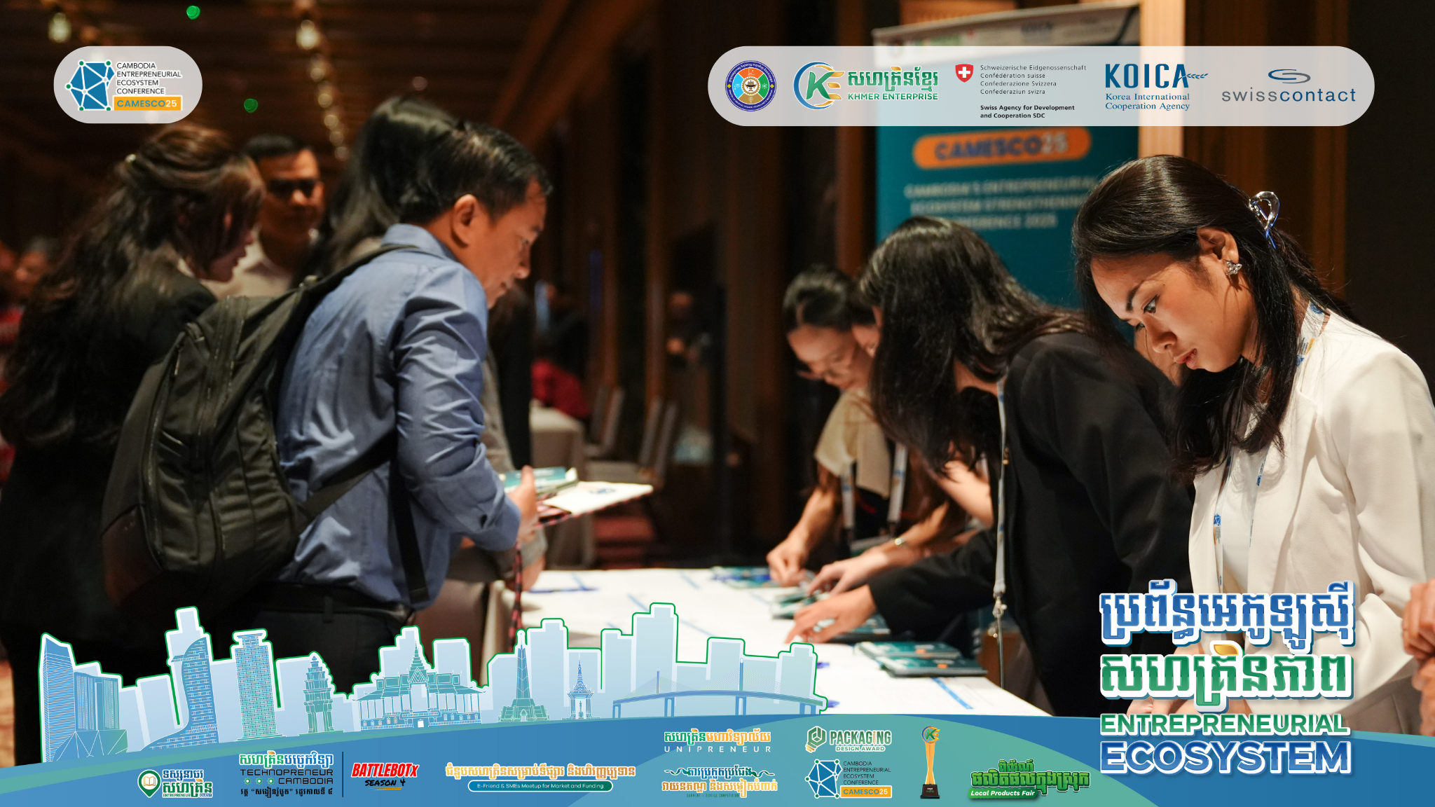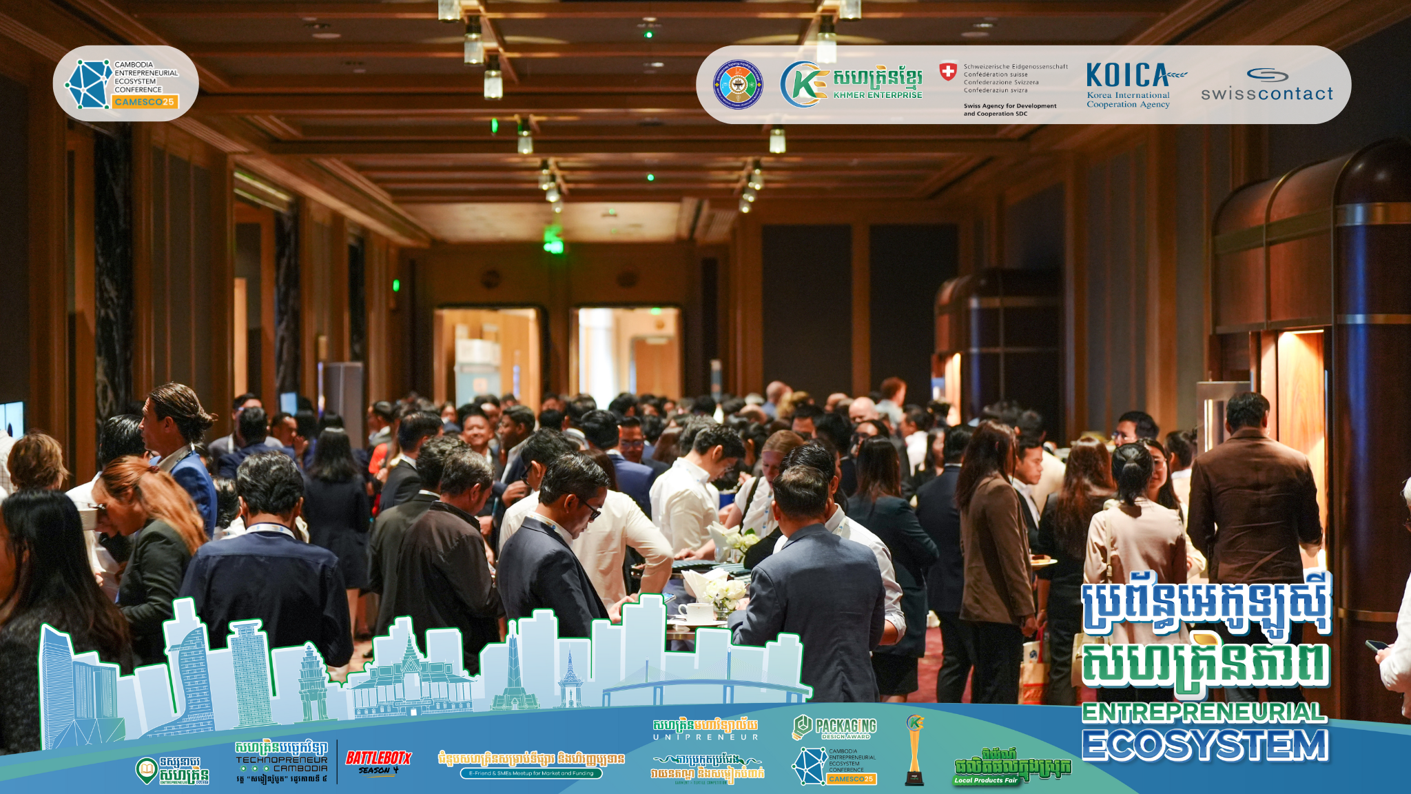 រាជធានីភ្នំពេញ ៖ នាថ្ងៃទី២១ ខែវិច្ឆិកា ឆ្នាំ២០២៥៖ កម្មវិធីសន្និសីទប្រចាំឆ្នាំស្តីពីការពង្រឹងប្រព័ន្ធអេកូឡូស៊ីសហគ្រិន- ភាពនៅកម្ពុជា ​(CAMESCO25) ត្រូវបានរៀបចំឡើងដោយមានអ្នកចូលរួមប្រមាណ ២៥០នាក់ មកពីស្ថាប័ន ដៃគូប្រហែលចំនួន ១៥០ស្ថាប័ន។ ប្រធានបទសម្រាប់កម្មវិធី CAMESCO ឆ្នាំ២០២៥ នេះគឺ​ “ពីការសហការគ្នា ទៅជាកាតាលីករជំរុញការផ្លាស់ប្តូរជាប្រព័ន្ធ” ដែលជាកិច្ចសហប្រតិបត្តិការរៀបចំដោយ សហគ្រិនខ្មែរ (Khmer Enterprise) និងអង្គការស្វីសខន់ថាក់កម្ពុជា​ (Swisscontact Cambodia) និងតាមរយៈការផ្តល់ ហិរញ្ញប្បទានពីសហគ្រិនខ្មែរ, ទីភ្នាក់ងារស្វីសសម្រាប់ការអភិវឌ្ឍ និងសហប្រតិបត្តិការ (SDC) និងទី​​​ភ្នាក់ងារ សហប្រតិបត្តិការអន្តរជាតិកូរ៉េ (KOICA)។ សន្និសីទនេះ គឺជាអនុសកម្មភាពមួយក្រោមកម្មវិធីការពង្រឹងប្រព័ន្ធ អេកូឡូស៊ីសហគ្រិនភាព និងការវិនិយោគ (3EI)។