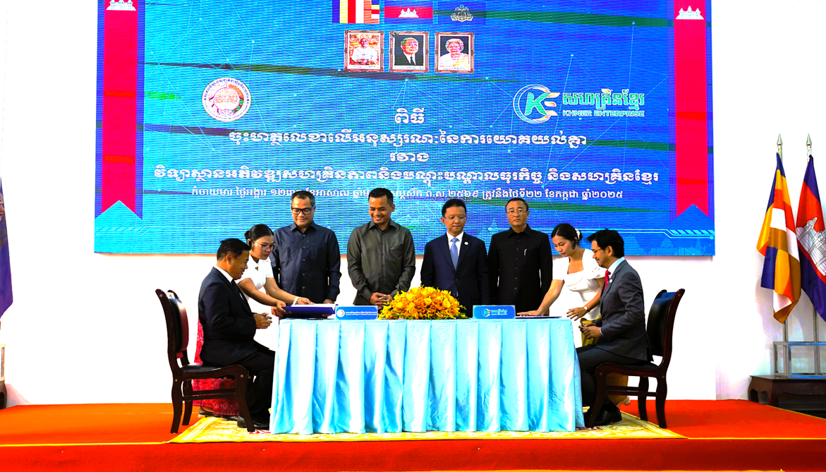 ព្រៃវែង ៖ សហគ្រិនខ្មែរ (KE) បានចុះហត្ថលេខាជាផ្លូវការលើអនុស្សរណៈនៃការយោគយល់ (MoU) ជាមួយវិទ្យាស្ថានអភិវឌ្ឍសហគ្រិនភាព និងបណ្តុះបណ្តាលធុរកិច្ច (EDII) នៃសាកលវិទ្យាល័យជាតិ ជា ស៊ីមកំចាយមារ (NUCK) នៅថ្ងៃអង្គារ ទី២២ ខែកក្កដា ឆ្នាំ២០២៥។ ពិធីចុះហត្ថលេខាត្រូវបានប្រារព្ធធ្វើឡើងនៅវិទ្យាស្ថានទ្យាស្ថានអភិវឌ្ឍ និងបណ្តុះបណ្តាលធុរកិច្ច ដែលស្ថិតក្នុងបរិវេណនៃសាកលវិទ្យាល័យជាតិ ជាស៊ីម កំចាយមារ ស្រុកកំចាយមារ ខេត្តព្រៃវែង ក្រោមអធិបតីភាពដ៏ខ្ពង់ខ្ពស់របស់ ឯកឧត្តមអភិសន្តិបណ្ឌិត ស សុខា ឧបនាយករដ្ឋមន្ត្រី រដ្ឋមន្ត្រីក្រសួងមហាផ្ទៃ និងជាប្រធានក្រុមប្រឹក្សាភិបាលនៃសាកលវិទ្យាល័យជាតិ ជា ស៊ីម កំចាយមារ និងឯកឧត្តម ហែម វណ្ណឌី រដ្ឋមន្ត្រីក្រសួងឧស្សាហកម្ម វិទ្យាសាស្ត្រ បច្ចេកវិទ្យា និងនវានុវត្តន៍ និងជាប្រធានក្រុមប្រឹក្សាភិបាលនៃសហគ្រិនខ្មែរ។