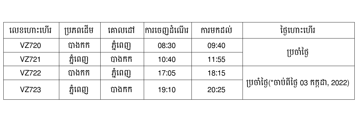 ចាប់តាំងពីខែឧសភា ឆ្នាំ ២០២២ ក្រុមហ៊ុនអាកាសចរណ៍ ថៃ វៀតចេត បានបើកដំណើរការជើងហោះហើររវាងរាជធានីភ្នំពេញ និងទីក្រុងបាងកក ដែលមានកាលវិភាគត្រឹមតែមួយជើងក្នុងមួយថ្ងៃ (ជើងហោះហើរប្រចាំថ្ងៃ) ដោយបច្ចុប្បន្នថៃ វៀតចេតបានបង្កើនការហោះហើរ ២ ដងក្នុងមួយថ្ងៃ ដូចទៅតាមកាលវិភាគហោះហើរខាងក្រោម៖