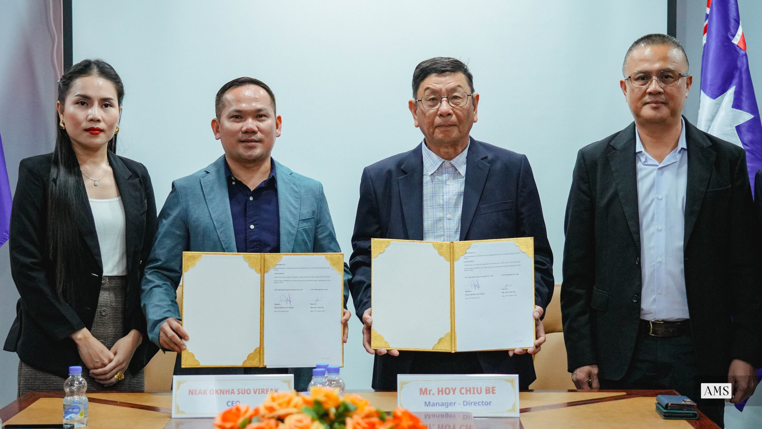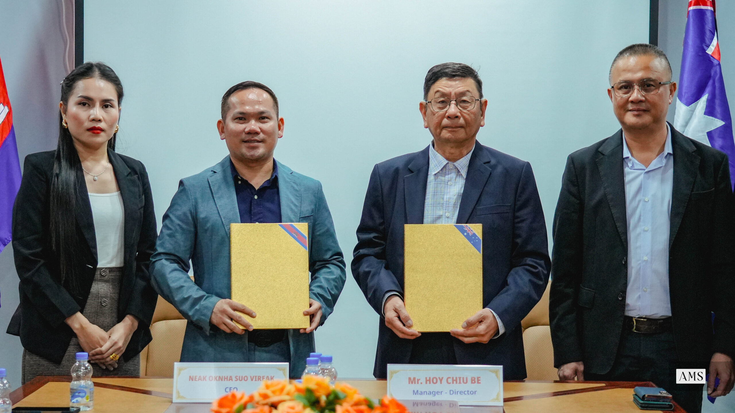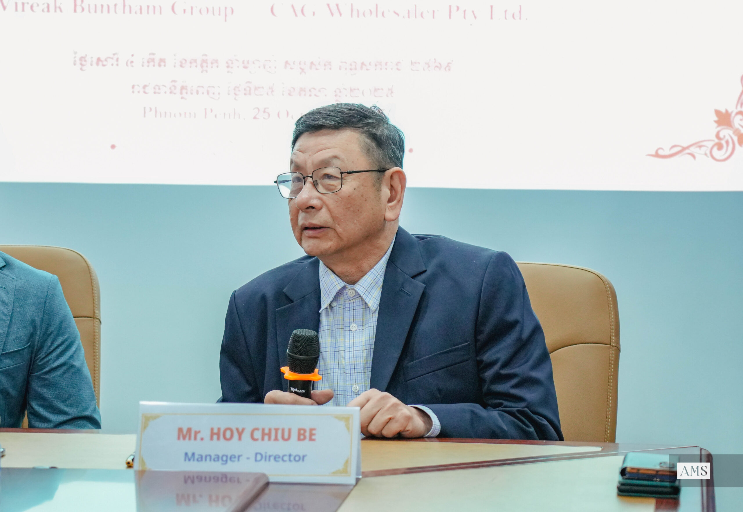 អ្នកឧកញ៉ា សួរ វីរៈ អគ្គនាយកក្រុមហ៊ុន វិរៈ ប៊ុនថាំ អេចប្រេស និងលោក HOY CHIU BE នាយកគ្រប់គ្រងក្រុមហ៊ុន ស៊ីអេជី ហូលសេលឡឺ ភីធីវ៉ាយ អិលធីឌី បានចុះហត្ថលេខាលើកិច្ចព្រមព្រៀងដែលធ្វើឡើងនាព្រឹកថ្ងៃទី២៥ ខែតុលា ឆ្នាំ២០២៥ នៅទីស្នាក់ការកណ្តាលក្រុមហ៊ុន វិរៈ ប៊ុនថាំ គ្រុប រាជធានីភ្នំពេញ។