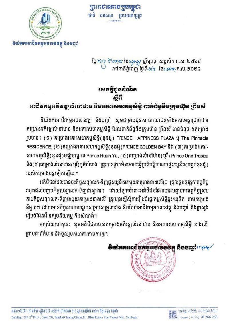 សូមបញ្ជាក់ថា និយ័តករអាជីវកម្មអចលនទ្រព្យ និងបញ្ចាំ នៃក្រសួងសេដ្ឋកិច្ច និងហិរញ្ញវត្ថុ កាលពីថ្ងៃទី ១២ ខែមករា ឆ្នាំ២០២៥ បានជូនដំណឹងស្ដីពីការសម្រេចផ្អាកធ្វើប្រតិបត្តិការលក់គម្រោងអភិវឌ្ឍលំនៅឋាន និង ខុនដូ ចំនួន៥ របស់ក្រុមហ៊ុន ព្រីនស៍ ដែលការសម្រេចនេះ ត្រូវបានធ្វើឡើងបន្ទាប់ពីកម្ពុជាចាប់បញ្ជូនមេខ្លោងរបស់ក្រុមហ៊ុននេះ គឺលោក ចេន ហ្ស៊ី បញ្ជូនទៅកាន់ប្រទេសចិនវិញ ពាក់ព័ន្ធឧក្រិដ្ឋកម្ម Online Scam ៕