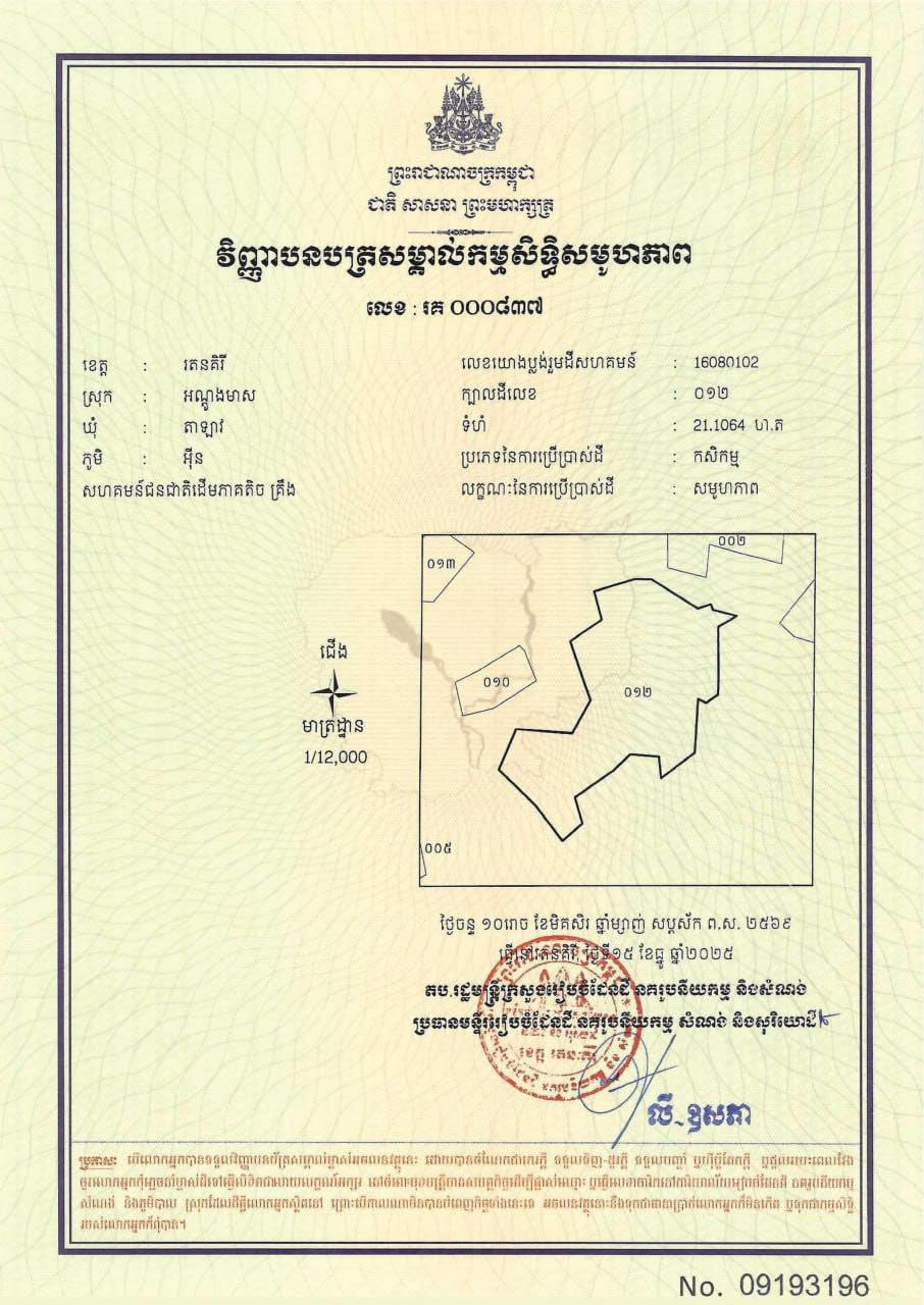 គួររម្លឹកថា កាលពីប៉ុន្មានសប្ដាហ៍មុននេះ ឯកឧត្តមឧបនាយករដ្ឋមន្ត្រី សាយ សំអាល់ រដ្ឋមន្ត្រីក្រសួងរៀបចំដែនដី នគរូបនីយកម្ម និងសំណង់ បានអញ្ជើញចុះប្រគល់វិញ្ញាបនបត្រសម្គាល់កម្មសិទ្ធិសមូហភាពជូនពលរដ្ឋជនជាតិដើមភាគតិចនៅខេត្តក្រចេះ ខេត្តរតនគិរី និងខេត្តមណ្ឌលគិរី ។ ដោយឡែក នៅខេត្តរតនគិរី ឯកឧត្តម បានចុះប្រគល់ដោយផ្ទាល់ដល់ពលរដ្ឋក្នុងសហគមន៍នៃស្រុកអូរជុំ ខេត្តរតនគិរី ។