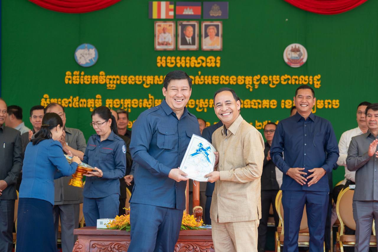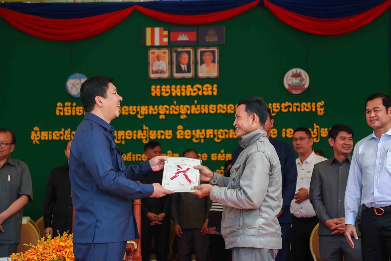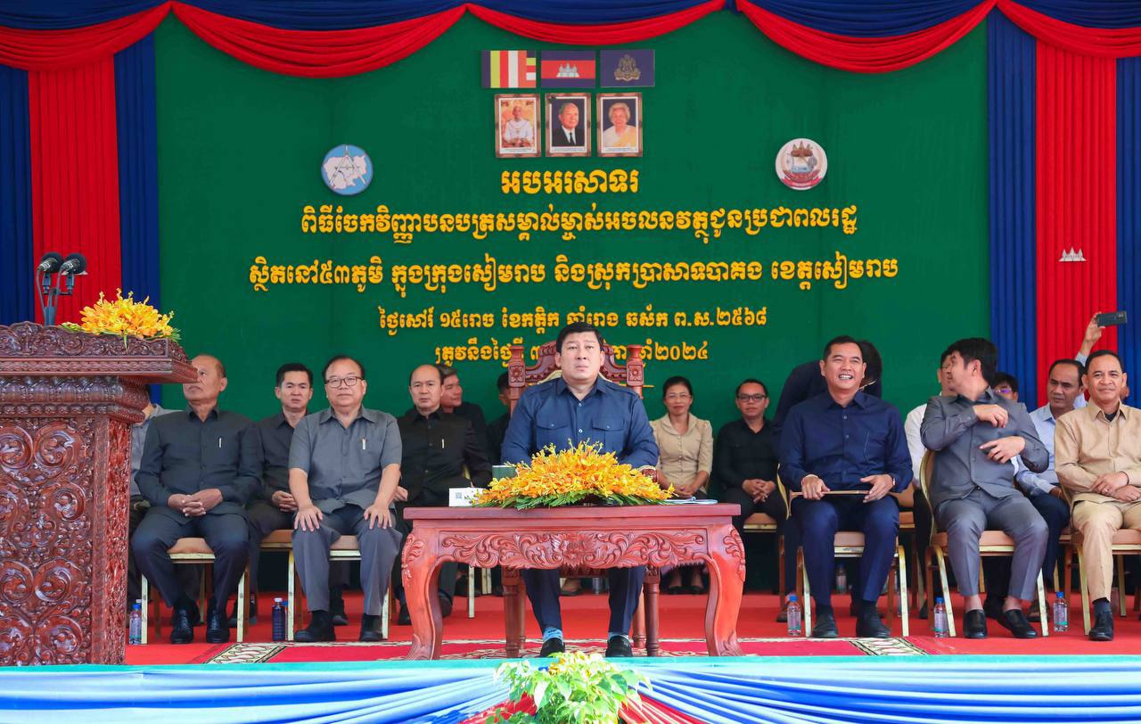 (សៀមរាប)៖ ប្រជាពលរដ្ឋចំនួន ៥៣ ភូមិដែលមានដីដកចេញពីបញ្ជីបុរាណដ្ឋានក្នុងក្រុងសៀមរាបនិងស្រុកប្រាសាទបាគងខេត្តសៀមរាបទទួលបានវិញ្ញាបនបត្រសម្គាល់ម្ចាស់អចលនវត្ថុពី ឯកឧត្តម ឧបនាយករដ្ឋមន្ត្រី សាយ សំអាល់ រដ្ឋមន្ត្រីក្រសួងរៀបចំដែនដី នគរូបនីយកម្ម និងសំណង់ នាព្រឹកថ្ងៃទី៣០ ខែវិច្ឆិកា ឆ្នាំ ២០២៤។