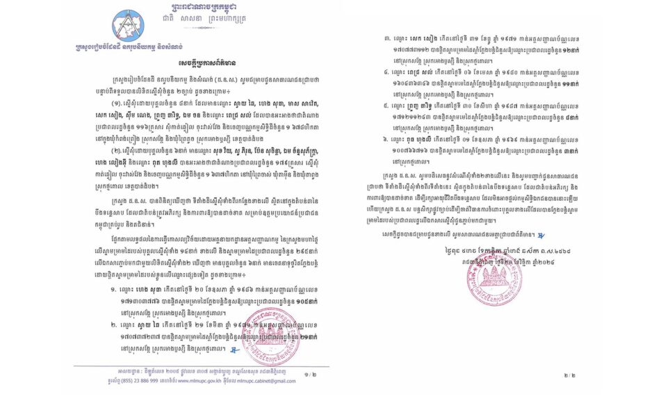 សេចក្តីដូចបានជម្រាបជូនខាងលើ សូមសាធារណជនមេត្តាជ្រាបជាព័ត៌មាន៕
