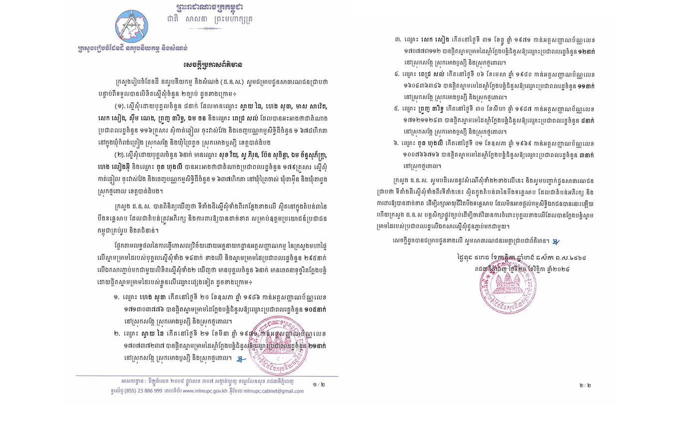 ក្រសួងរៀបចំដែនដី នគរូបនីយកម្ម និងសំណង់ (ដ.ន.ស.) សូមជម្រាបជូនសាធារណជនជ្រាបថា បន្ទាប់ពីទទួលបានលិខិតស្នើសុំចំនួន ២ច្បាប់ ដូចខាងក្រោម៖