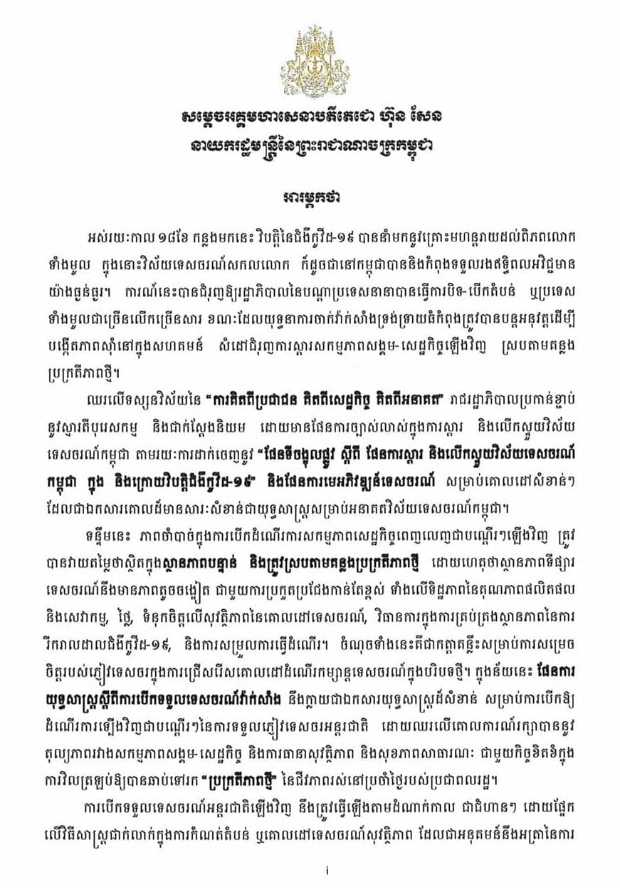 ឆ្លៀតឱកាសនេះ ក្នុងនាមរាជរដ្ឋាភិបាលកម្ពុជា ខ្ញុំសូមសម្ដែងនូវការកោតសរសើរ និងវាយតម្លៃខ្ពស់ចំពោះក្រុមការងារក្រសួងទេសចរណ៍ និងក្រុមការងាររាជរដ្ឋាភិបាល និងឯកជន ដើម្បីស្តារ និងលើកស្ទួយវិស័យទេសចរណ៍កម្ពុជា ក្នុង និងក្រោយវិបត្តិជំងឺកូវីដ-១៩ ដែលបានរៀបចំឯកសារផែនការយុទ្ធសាស្ត្រដ៏សំខាន់នេះ ចំពេលវេលាដ៏ចាំបាច់ សម្រាប់វិស័យទេសចរណ៍ជាតិ ក្នុងដំណាក់កាលដ៏លំបាកនេះ។ ខ្ញុំសូមអំពាវនាវដល់គ្រប់ក្រសួង-ស្ថាប័ន វិស័យឯកជន ប្រជាពលរដ្ឋ និងភ្ញៀវទេសចរជាតិ-អន្តរជាតិ ត្រូវប្រកាន់់ភ្ជាប់នូវឆន្ទៈទទួលខុសត្រូវខ្ពស់ ដោយផ្តល់អាទិភាពដល់ការអនុវត្តផែនការយុទ្ធសាស្ត្រស្តីពីការបើកទទួលទេសចរណ៍វ៉ាក់សាំងឱ្យទទួលបានជោគជ័យ ដើម្បីរួមចំណែកដល់ការធានានិរន្តរភាព និងការស្ដារកំណើនសេដ្ឋកិច្ច៕