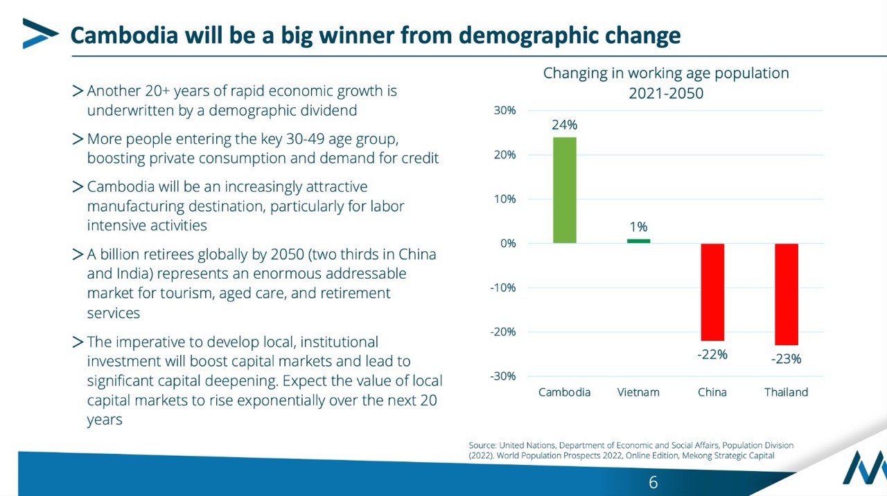 ភ្នំពេញ ៖ កម្ពុជានឹងអាចក្លាយជាប្រទេសទទួលបានប្រយោជន៍ធំធេងជាងគេពីការផ្លាស់ប្តូរប្រជាសាស្ត្រនៅក្នុងតំបន់ ដោយប្រជាជនវ័យក្មេងពោរពេញដោយថាមពល និងលទ្ធភាពការងារ នឹងមានកំណើនប្រមាណ ២៤ ភាគរយ ក្នុងការចូលរួមជំរុញកំណើនសេដ្ឋកិច្ចជាតិ ខណៈវៀតណាមនឹងមានកំណើនត្រឹមតែ ១ ភាគរយ ប៉ុន្តែថៃត្រូវបានព្យាករណ៍ថានឹងធ្លាក់ចុះ ២៣ ភាគរយ ហើយចិននឹងធ្លាក់ចុះ ២២ ភាគរយ។ នេះបើយោងតាមការសិក្សារបស់ស្ថាប័ន Mekong Strategic Partners។