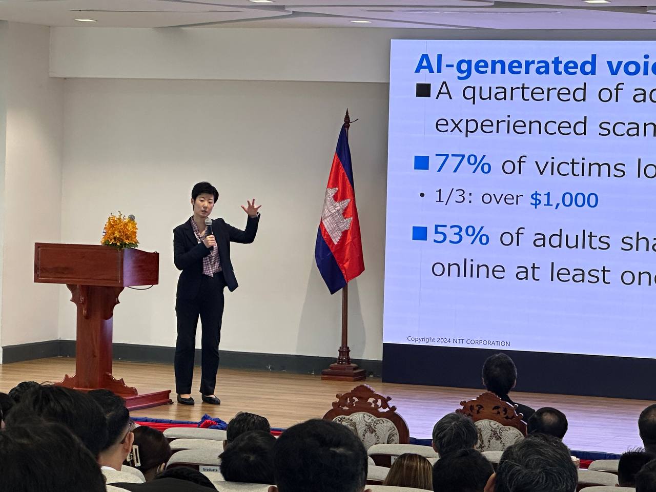 នៅក្នុងសិក្ខាសាលានេះ លោកស្រី MATSUBARA Mihoko ប្រធានអ្នកយុទ្ធសាស្ត្រផ្នែកសន្តិសុខសាយប៊័រ នៃសាជីវកម្មNTT ប្រទេសជប៉ុន បានចែករំលែកចំណេះដឹងអំពីការគំរាមកំហែង និងការការពារតាមប្រព័ន្ធសាយប៊័រ។