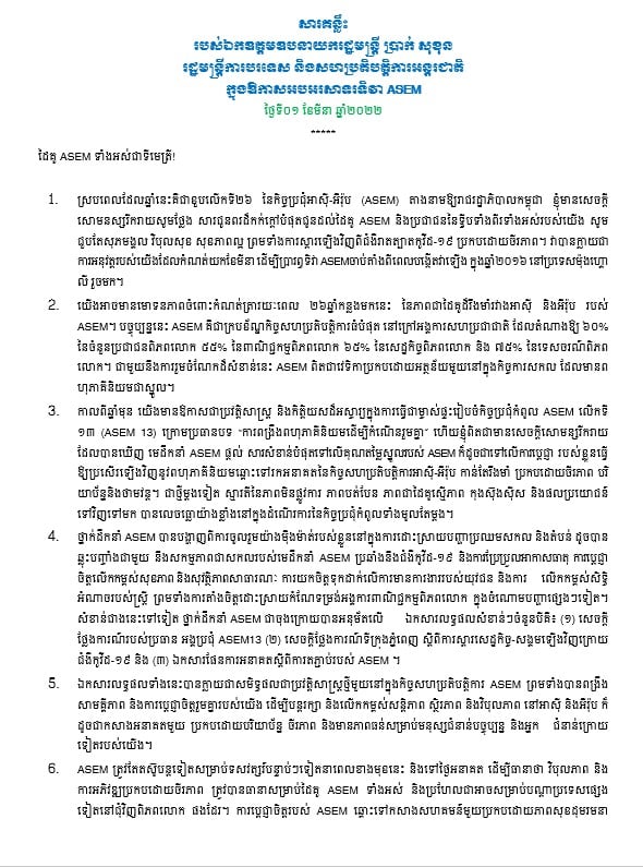 ១- ស្របពេលដែលឆ្នាំនេះគឺជាខួបលើកទី២៦ នៃកិច្ចប្រជុំអាស៊ី-អឺរ៉ុប (ASEM) តាងនាមឱ្យរាជរដ្ឋាភិបាលកម្ពុជា ខ្ញុំមានសេចក្តីសោមនស្សរីករាយសូមថ្លែង សារជូនពរដ៏កក់ក្តៅបំផុតជូនដល់ដៃគូ ASEM និងប្រជាជននៃទ្វីបទាំងពីរទាំងអស់របស់យើង សូមជួបតែសុភមង្គល វិបុលសុខ សុខភាពល្អ ព្រមទាំងការស្តារឡើងវិញពីជំងឺរាតត្បាតកូវីដ-១៩ ប្រកបដោយចីរភាព។ វាបានក្លាយជាការអនុវត្តរបស់យើងដែលកំណត់យកខែមីនា ដើម្បីប្រារព្ធទិវា ASEM ចាប់តាំងពីពេលបង្កើតវាឡើង ក្នុងឆ្នាំ២០១៦ នៅប្រទេសម៉ុងហ្គោលី រួចមក។