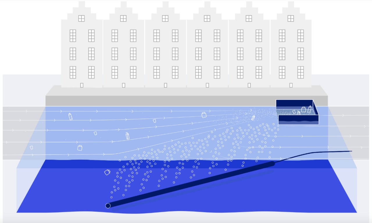 ឧបករណ៍ងាយៗត្រូវបានតម្លើងនៅបាតទន្លេនៃទីក្រុងដែលអាចបញ្ចេញពពុះទឹកយ៉ាងច្រើន និងបង្កើតបានជារនាំងមួយដែលអាចឃាត់ឃាំងកាកសំណល់នានាមិនឲ្យហូរចេញពីទន្លេនៅក្នុងទីក្រុងទៅដល់សមុទ្រឡើយ។ ពពុះទឹកបានរុញច្រានឲ្យកាកសំណល់ចាប់តាំងពីទំហំតូចៗត្រឹម១មីលីម៉ែត្រទៅដល់កាកកសំណល់ដែលមានទំហំធំៗទាំងឡាយឡើងទៅលើផ្ទៃទឺកនិងហូរទៅដល់ទីតាំងក្បែរច្រាំងទន្លេមួយដែលក្រុមការងារបានតៀមសម្រាប់ស្តុកកាកសំណល់ និងអាចធ្វើការប្រមូលសំរាមបានយ៉ាងងាយពីផ្ទៃទឹក។