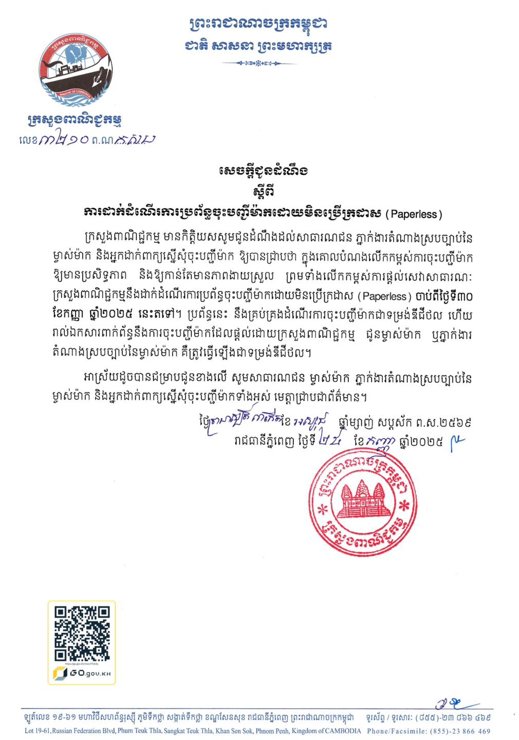 ភ្នំពេញ៖ ក្រសួងពាណិជ្ជកម្ម បានដាក់ឱ្យដំណើរការប្រព័ន្ធចុះបញ្ជីម៉ាកដោយមិនប្រើក្រដាស (Paperless) ទៀតទេ និងចាប់អនុវត្តពីថ្ងៃទី៣០ ខែកញ្ញា ឆ្នាំ២០២៥ នេះតទៅ។ ប្រព័ន្ធនេះនឹងគ្រប់គ្រងដំណើរការចុះបញ្ជីម៉ាកជាទម្រង់ឌីជីថល ហើយរាល់ឯកសារពាក់ព័ន្ធ និងការចុះបញ្ជីម៉ាកដែលផ្តល់ដោយក្រសួងពាណិជ្ជកម្មជូនដល់ម្ចាស់ម៉ាក ឬភ្នាក់ងារតំណាងស្របច្បាប់នៃម្ចាស់ម៉ាក គឺត្រូវធ្វើឡើងជាទម្រង់ឌីជីថលជំនួសវិញទាំងអស់។