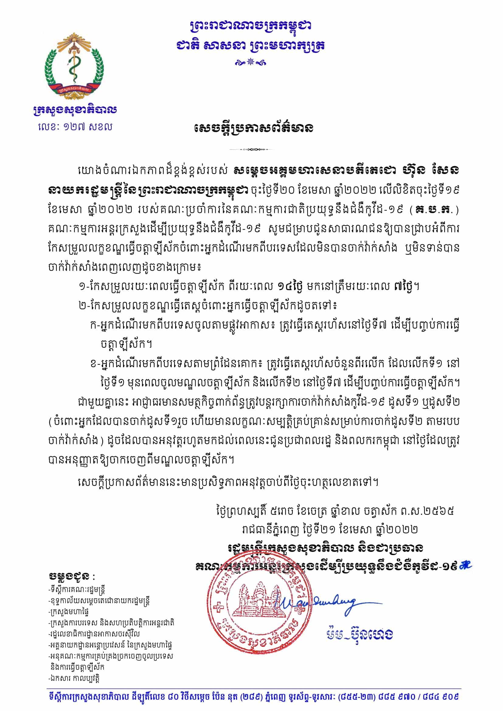 តាមរយៈសេចក្ដីប្រកាសព័ត៌មានដដែលបានបញ្ជាក់ថា យោងចំណារឯកភាពដ៏ខ្ពង់ខ្ពស់របស់ សម្តេចតេជោ ហ៊ុន សែន នាយករដ្ឋមន្ត្រីនៃកម្ពុជា ចុះថ្ងៃទី២០ ខែមេសា ឆ្នាំ២០២២ លើលិខិតចុះថ្ងៃទី១៩ ខែមេសា ឆ្នាំ២០២២ របស់គណៈប្រចាំការនៃគណៈកម្មការជាតិប្រយុទ្ធនឹងជំងឺកូវីដ-១៩, គណៈកម្មការអន្តរក្រសួង ដើម្បីប្រយុទ្ធនឹងជំងឺកូវីដ-១៩ សូមជម្រាបជូនសាធារណជនឱ្យបានជ្រាបអំពីការកែសម្រួលលក្ខខណ្ឌធ្វើចត្តាឡីស័ក ចំពោះអ្នកដំណើរមកពីបរទេស ដែលមិនបានចាក់វ៉ាក់សាំង ឬមិនទាន់បានចាក់វ៉ាក់សាំងពេញលេញដូចខាងក្រោម៖