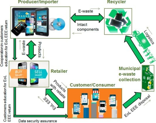A New Circular Vision for Electronics បានស្រាវជ្រាវរកឃើញថាកាកសំណល់អេតចាយជាផលិតផលបច្ចេកវិទ្យា ឬ e-waste នៅ លើពិភពលោកដែលត្រូវបានកែច្នៃមានត្រឹមតែ១ភាគ៥ប៉ុណ្ណោះ ហើយភាគច្រើនត្រូវបានគេដឹកជញ្ជូនទៅចាក់ចោលនៅតំបន់អាហ្វ្រិក និងតំបន់អាស៊ីដែលវានឹងក្លាយទៅជាទីកន្លែងទទួលរងនូវផលប៉ះពាល់ខ្លាំងដោយសារសារធាតុពុលដែលមានពីខាងក្នុង។ អ្នកជំនាញបានបញ្ជាក់ទៀតថា អតិថិជនស្ទើរតែ១០០ភាគរយដែលប្រើប្រាស់ផលិតផលបច្ចេកវិទ្យាមិនបានដឹងពីរបៀបដែលត្រូវយកវាទៅកែច្នៃ ឬបោះចោលឲ្យបានត្រឹមត្រូវឡើយ ដូច្នេះរោងចក្រផលិតទាំងអស់ត្រូវតែមានទំនួលខុសត្រូវធំជាងគេបំផុតចំពោះបញ្ហានេះ ហើយគួរតែបង្កើតនូវកម្មវិធីទិញត្រឡប់យកមកវិញនូវកាកសំណល់ e-waste ឬ Take Back schemes ដើម្បីធានាឲ្យបានថា វត្ថុធាតុដើមទាំងអស់គឺត្រូវបានកែច្នៃវិញជារៀងរាល់ និងនិរន្តភាពចំពោះធនធាននៅលើភពផែនដី៕