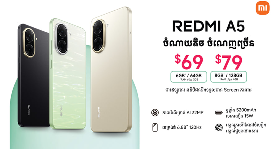 Xiaomi Corporation (“Xiaomi” ឬ “Group”; stock code: 1810) ដែលជាក្រុមហ៊ុនផលិតគ្រឿងអេឡិចត្រូនិក និងឧបករណ៍ឆ្លាតវៃ រួមមានស្មាតហ្វូន និង hardware ភ្ជាប់ដោយប្រព័ន្ធ Internet of Things (“IoT”) បានប្រកាសលក់នូវស្មាតហ្វូនស៊េរីថ្មី Redmi A5 ដែលបានដំឡើងនូវមុខងារពិសេសៗជាច្រើន អាចដំណើរការបានយ៉ាងរលូនសម្រាប់អតិថិជនរបស់ខ្លួន។ ជាមួយនឹងរូបរាងដ៏ស្រស់ស្អាត មានកាមេរ៉ាថតរូបបានច្បាស់ និងអេក្រង់ធំជាងមុន Redmi A5 បានបំប្លែងមុខងារសំខាន់ៗដែលនឹកស្មានមិនដល់ ជាពិសេសសោភ័ណភាពនៅលើស្មាតហ្វូនគួរជាទីទាក់ទាញ។