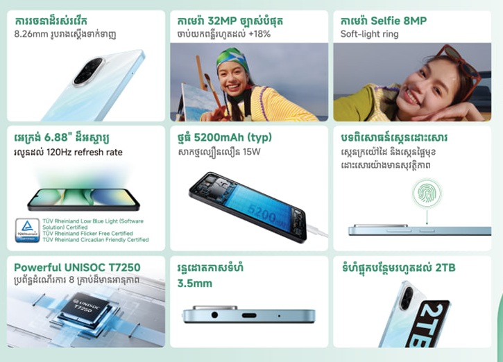 ជាមួយនឹងកាមេរ៉ាដ៏អស្ចារ្យ Redmi A5 ត្រូវបានរចនាឡើង ដើម្បីយ៉ាងល្អឥតខ្ចោះសម្រាប់ការរស់នៅនាពេលបច្ចុប្បន្នរបស់អ្នក ដោយផ្តល់ជូននូវលក្ខណៈពិសេសសម្រាប់ភាពជឿជាក់ និងភាពងាយស្រួលនៅគ្រប់កាលៈទេសៈ។ ដំណើរការដោយបន្ទះឈីប octa-core UNISOC T7250 និងគាំទ្រដោយ RAM ដល់ទៅ 8GB តាមរយៈការបន្ថែមមេម៉ូរី។ Redmi A5 ជាជំនួយការដោះស្រាយកិច្ចការច្រើន ដោយផ្តល់នូវដំណើរការកម្មវិធីយ៉ាងរលូន មិនថាជាការងារបែបណាដ៏ដោយ ។