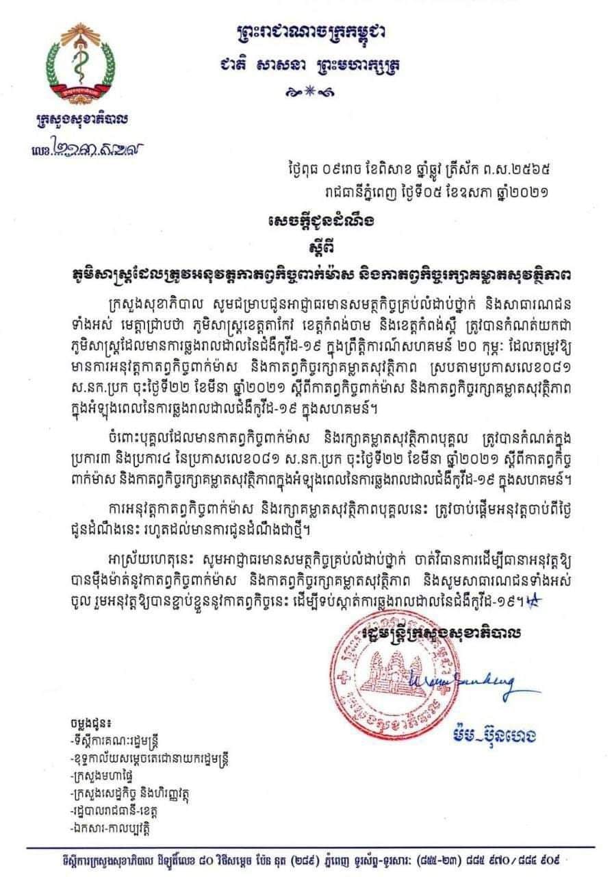 ក្រសួងសុខាភិបាលនៅថ្ងៃទី5 ខែឧសភា ឆ្នាំ2021នេះ បានកំណត់យកខេត្តចំនួន3ចាំបាច់ត្រូវតែអនុវត្តការពាក់ម៉ាសដាច់ខាត ព្រមទាំងរក្សាគម្លាតក្រោយមានការឆ្លងជំងឺកូវីដ-19 ជាបន្តបន្ទាប់ក្នុងសហគមន៍ រួមមានខេត្តកំពង់ចាម, តាកែវ និងខេត្តកំពង់ស្ពឺ ។